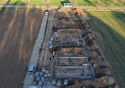 Realizácia rodinného bývania Tuchynský 4lístok sa naplno rozbehla. Po vytýčení stavieb a komunikácie sa začalo so zemnými prácami v celej lokalite. Po prípravných fázach (odstránenie ornice a jej uloženie na vhodnom mieste parcely) prišli na rad výkopové práce. Vo vzniknutých výkopoch sú realizované základové pásy z betónu na zhutnenom štrkovom lôžku. Pred betonážou základovej dosky sa ešte osadia všetky trasy inštalačných rozvodov, ktoré budú v základovej doske.
